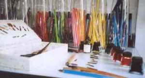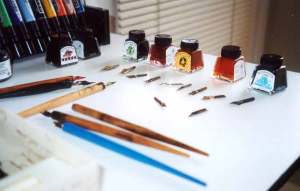 This modern illuminated manuscript, created by the faith of a single man working alone, is created with simple tools. No vellum and quill, but rather paper and art pencils (Prismacolor and Faber-Castell) and watercolors (Windsor and Newton) and pen and ink.
